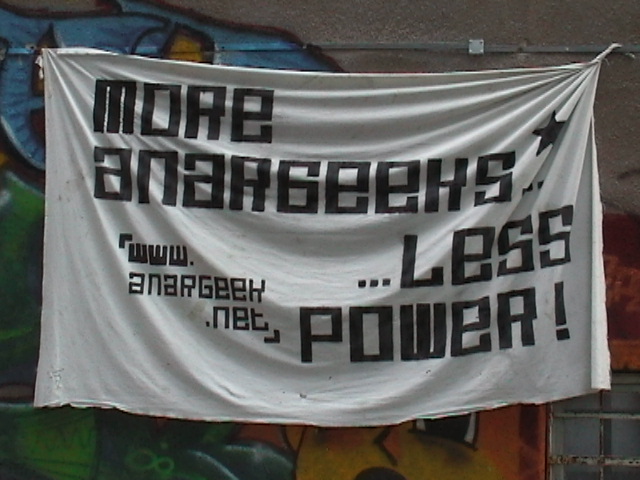 Thorsten mirabile Glaser designed an anargeek logo, which combines the "hacker emblem" proposed by ESR and the anarchist & socialist colours.